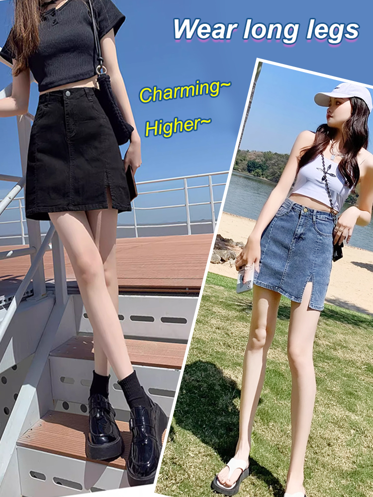 [Anti-exposure] High-waisted hip-wrapped slit denim skirt